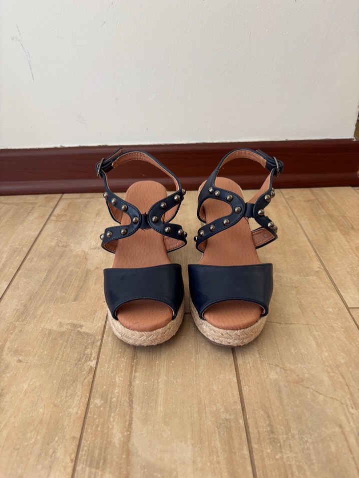 Kadınlar için tokalı lacivert kauçuk bantlı dolgu topuklu sandalet. Minimalist tasarımıyla günlük şıklık için uygundur.