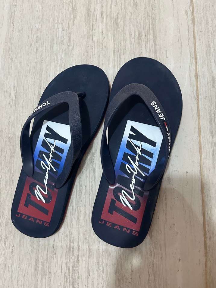 Tokalı kayışlara ve baskılı desene sahip lacivert erkek terlik, sokak stili ve günlük kullanım için uygundur. Rahat ve trend görünümlü.