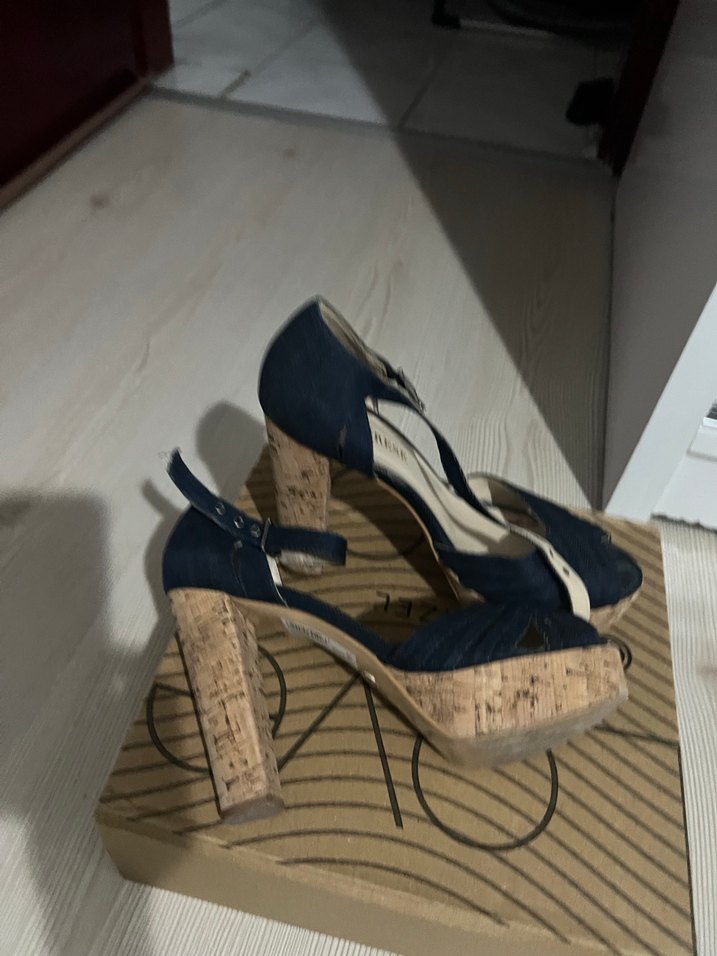 Kadınlar için lacivert baskılı, tokalı kayışlı ve kauçuk tabanlı platform topuklu ayakkabılar. Romantik akşamlar için ideal, mantar görünümlü topukları Paris tarzı katıyor. Az kullanıldı çokk iyi durumda marka