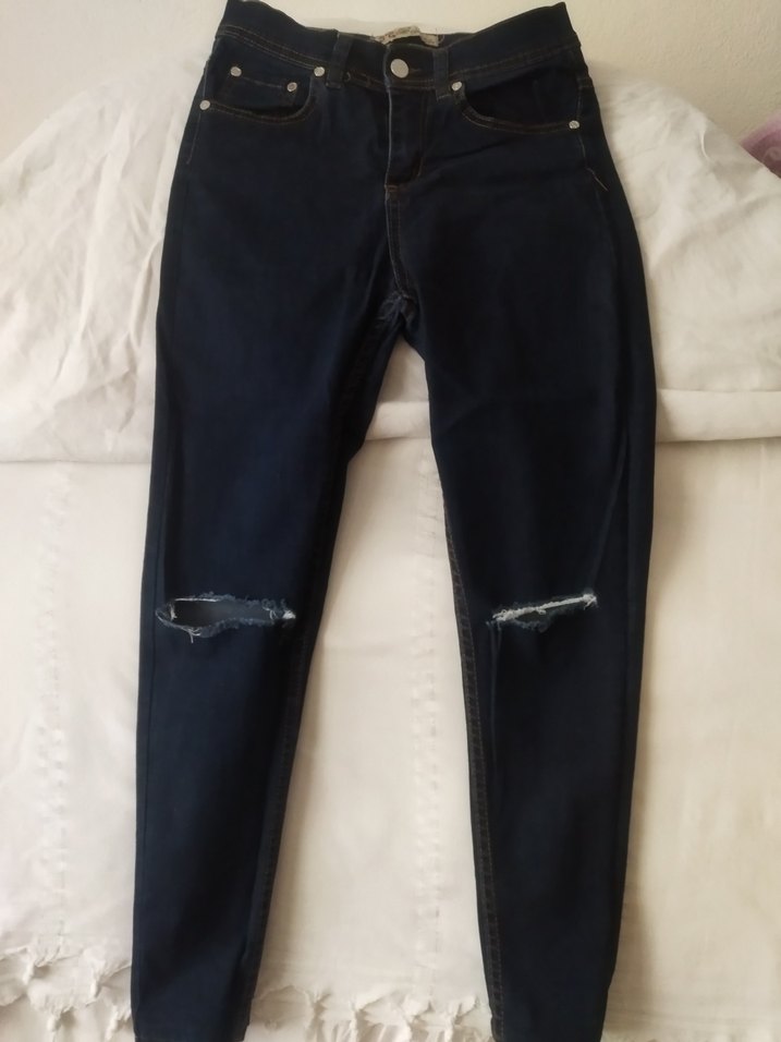 Tokalı detaylı, yırtık dizli lacivert skinny kadın kot pantolon, denim kumaştan, midi boyda ve günlük sokak tarzına uygun.