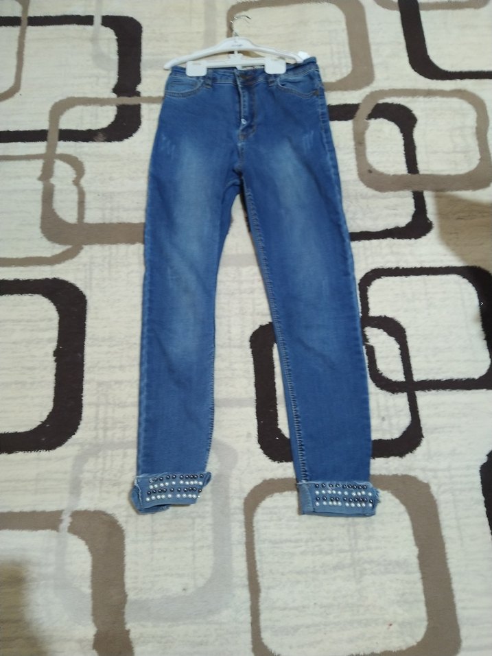 Tokalı detaylı, normal boy, regular fit mavi denim kadın pantolon, günlük rahat kullanım için uygundur.