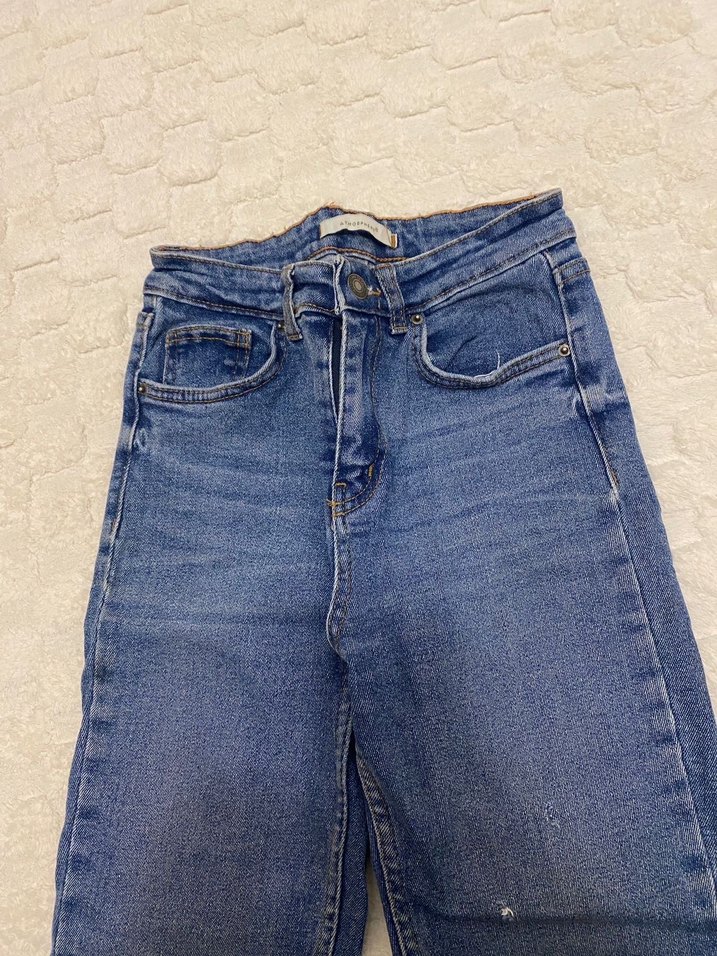 Tokalı, normal boy midi kesim mavi denim kadın pantolon. Günlük kullanıma uygun, sade ve trend bir tarza sahip.