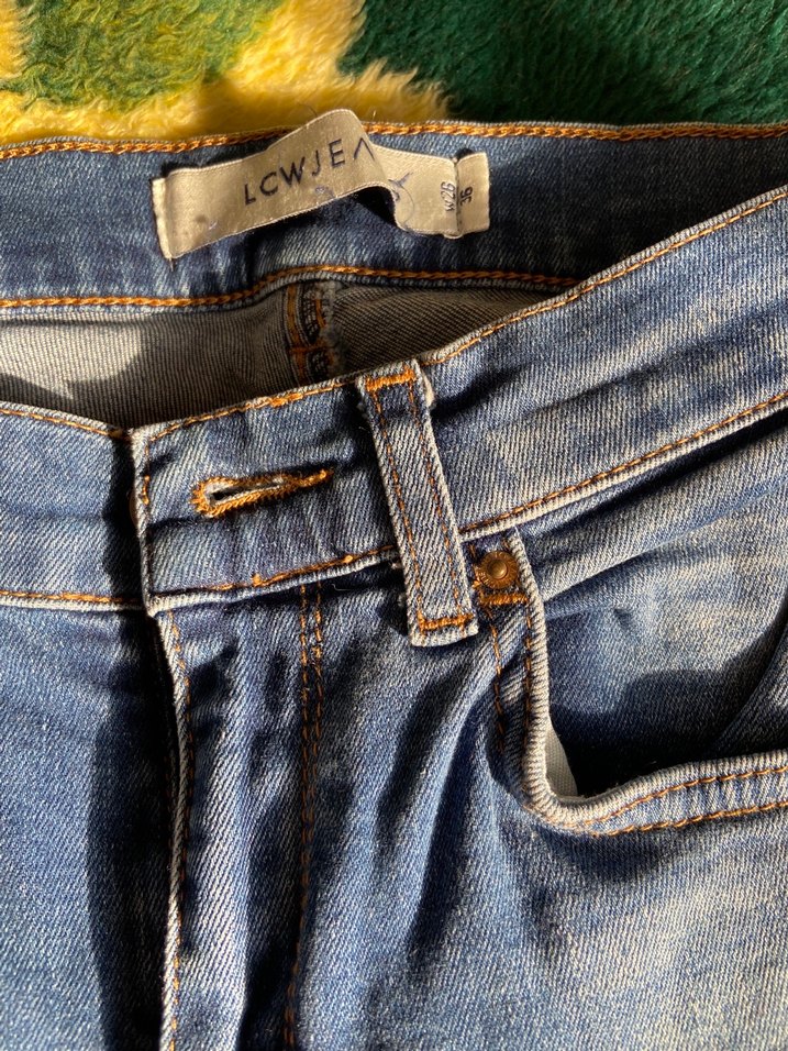 Tokalı detaylı, normal midi boyda, mavi renkte, sade desenli ve günlük kullanıma uygun kadın kot pantolon.