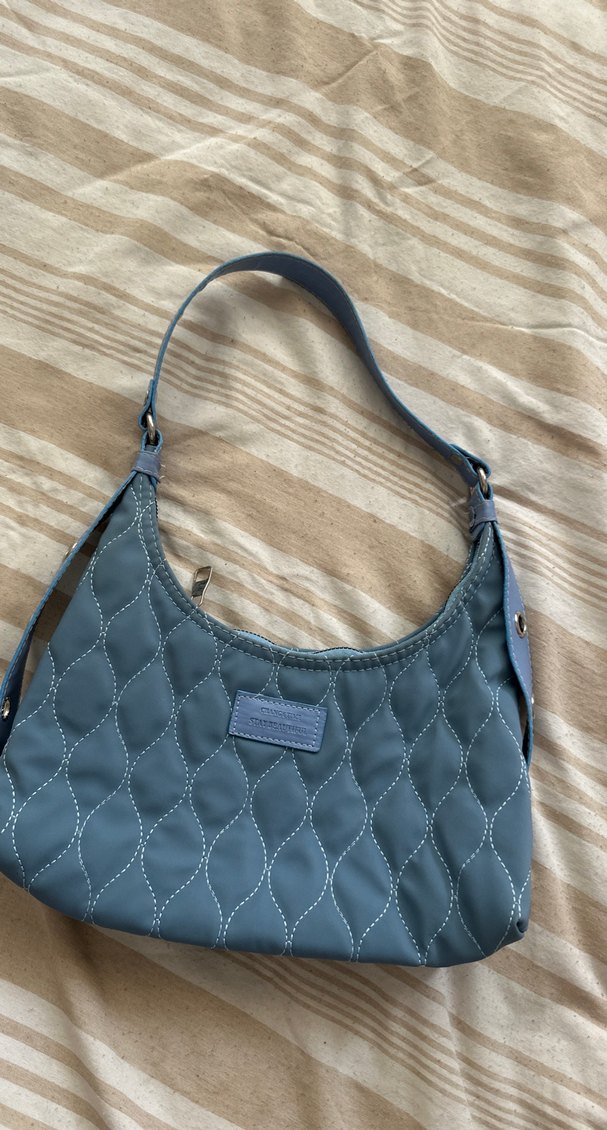 Mavi renkli, tokalı askıya sahip ve kapitone desende, sentetik kumaştan yapılmış kadın omuz çantasıdır.