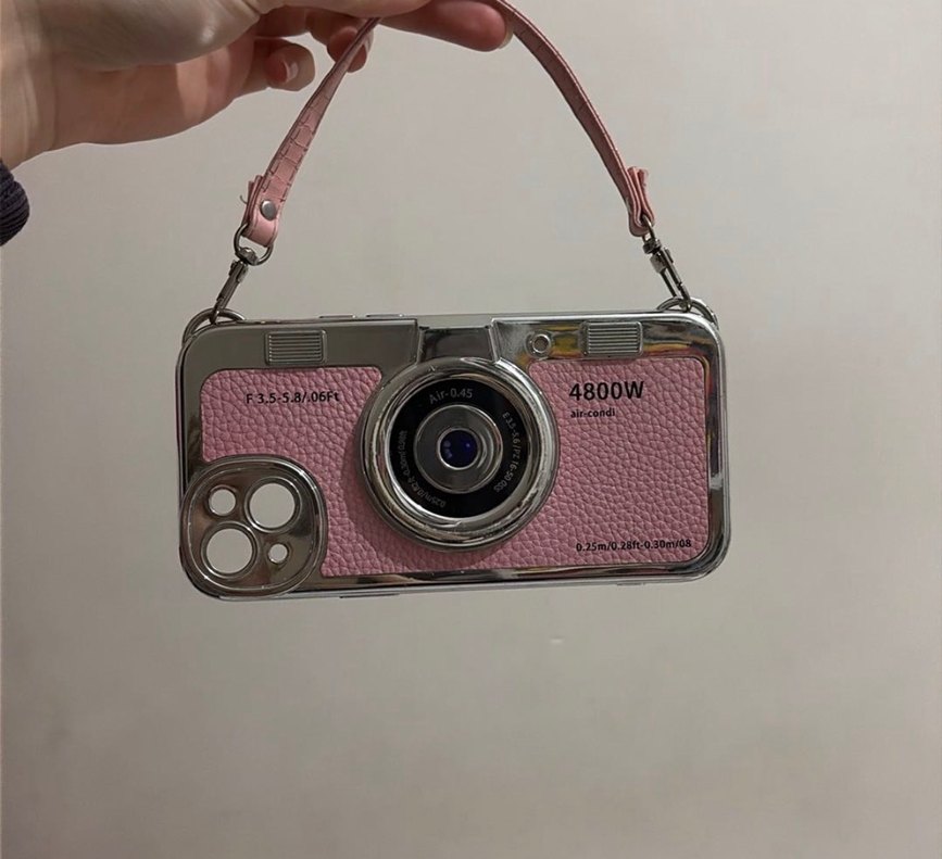 Pastel pembe renkte, tokalı kayışlı ve '4800W' yazılı kamera lens tasarımlı street wear tarzı telefon kılıfı.