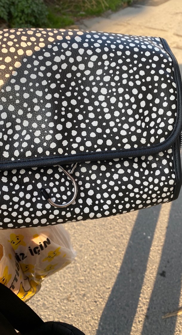 Siyah deri çanta, beyaz puantiyelerle süslü ve tokalı kapaklı, Paris sokak modasından esinlenmiş tarzda. makyaj