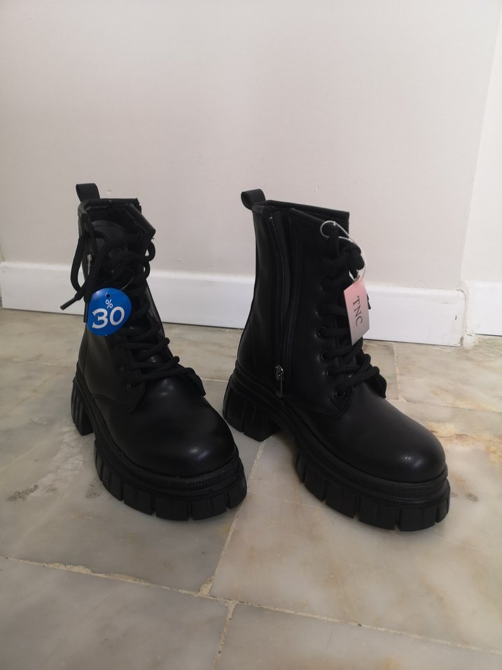 Siyah kauçuk malzemeden yapılmış, blok topuklu goth botlar. Tokalı ve baskılı detaylara sahip, rock punk havası ve sokak stiline uygun günlük kullanıma. Tnc marka