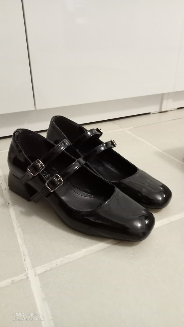 Parlak yüzeyli, çift tokalı siyah kadın ayakkabısı, blok topuklu, günlük kullanıma uygun.