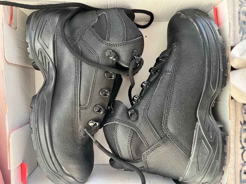 Tokalı detaylara sahip siyah deri biker botlar, dış mekan kullanımı için uygundur. Düz ve desen içermeyen tasarımıyla trend ve gotik tarzına uygundur.
