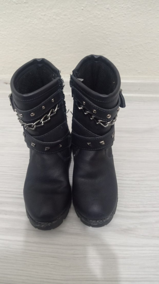 Tokalı kayışlar ve zincir detaylarına sahip siyah deri biker botlar. Dolgu topuklu ve günlük kullanıma uygun, grunge punk tarzında.