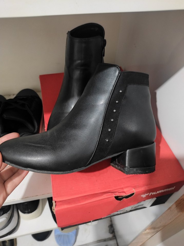 Tokalı ve küçük metal detaylı siyah deri blok topuklu kadın bot, günlük kullanım için uygun goth tarzında.