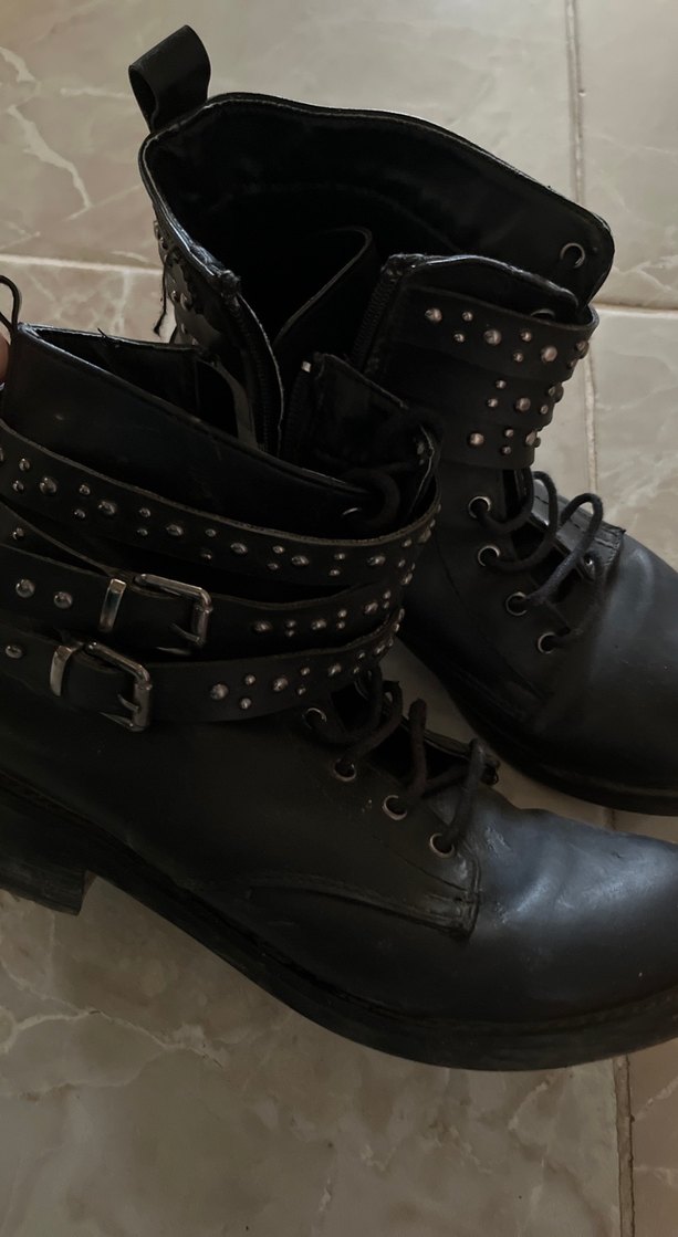 Tokalı kayışlar ve çivili detaylara sahip siyah deri botlar, blok topuklu. Desenli ve goth punk tarzında.