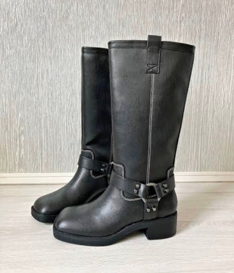 Siyah deri dizüstü botlar, tokalı detaylı ve kalın topuklu, biker tarzında, şık ve günlük kullanıma uygun. İADE DEĞİLİM YOK 1 kere kullanıldı