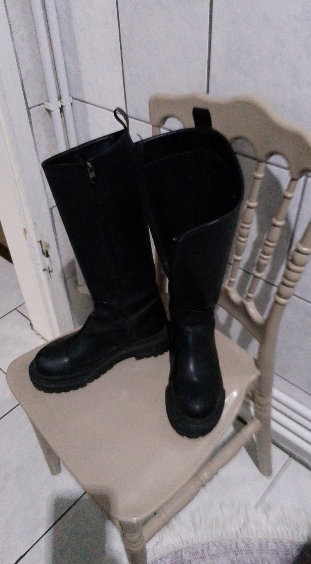 Siyah deri dizüstü çizme, stiletto topuk ve tokalı detaylı, gotik tarzda tasarlanmıştır. Günlük kullanım için uygundur.