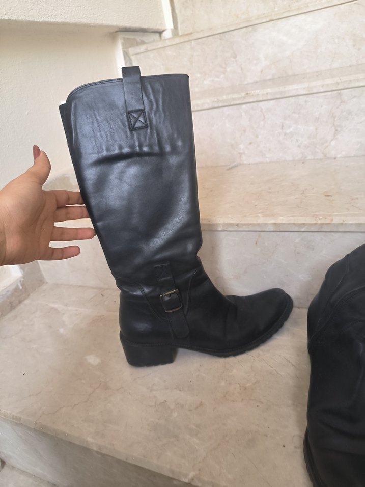 Tokalı detaylı, blok topuklu siyah deri dizüstü botlar. Minimalist gotik tarzda, günlük şık kullanım için uygundur.