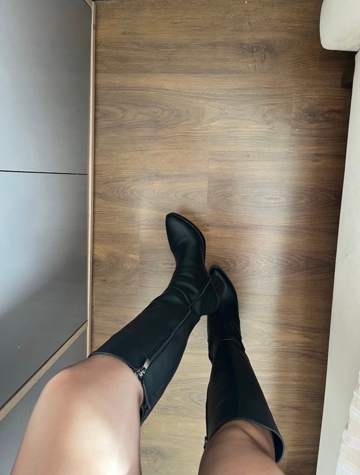 Siyah deri, tokalı, dizüstü kadın çizme. İnce topuklu ve minimalist goth tarzında, günlük kullanıma uygun.