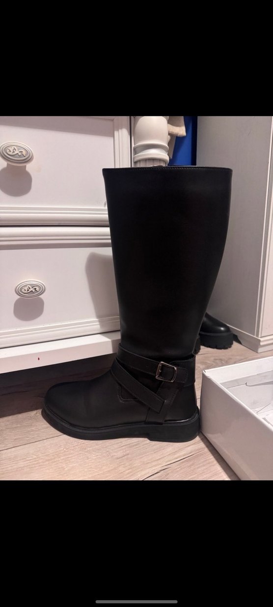 Tokalı detaylı, blok topuklu siyah deri dizüstü kadın çizme. Gotik stil, günlük şıklık için uygundur.önde hafif kırılma mevcutur o yüzden fiyatı indirdim
