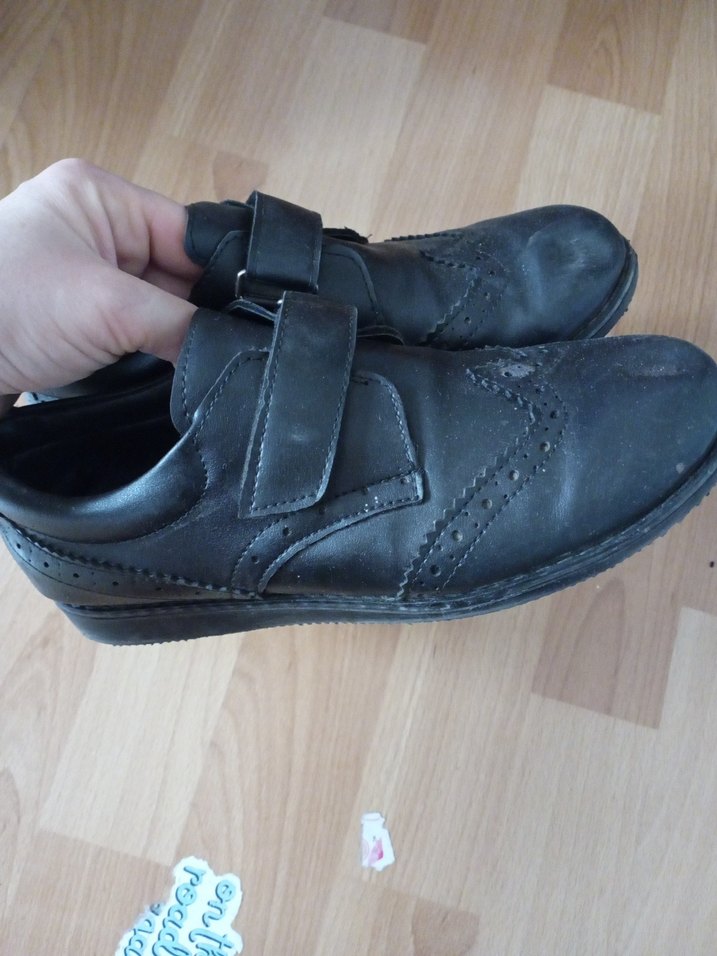 Tokalı ve düz tasarımlı siyah deri erkek çocuk ayakkabısı, hafif kullanılmış görünüme sahip. Özel günler için uygun.
