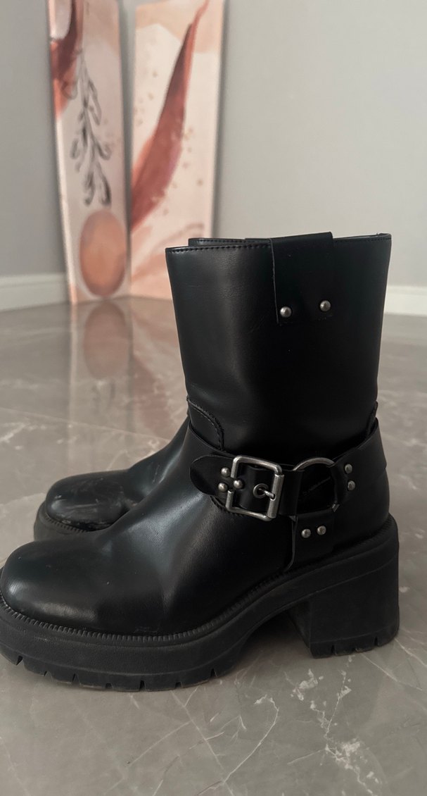 Blok topuklu, tokalı siyah deri goth botlar, günlük rock punk tarzına uygun. Dayanıklı ve şık, grunge punk görünüm için ideal.