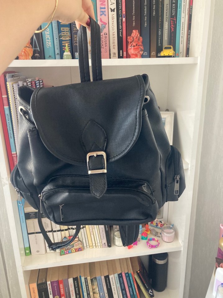 Tokalı kapaklı siyah deri sırt çantası, gotik tarzda ve günlük kullanıma uygun. Çoklu cepleri ve cesur tasarımı bulunur.