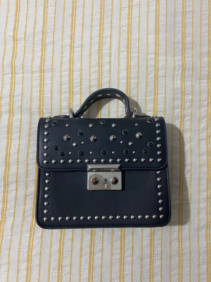 Siyah deri, tokalı ve metal zımbalarla süslenmiş, gotik ve rock punk tarzında nakışlı kadın çantası. Günlük kullanıma uygun.