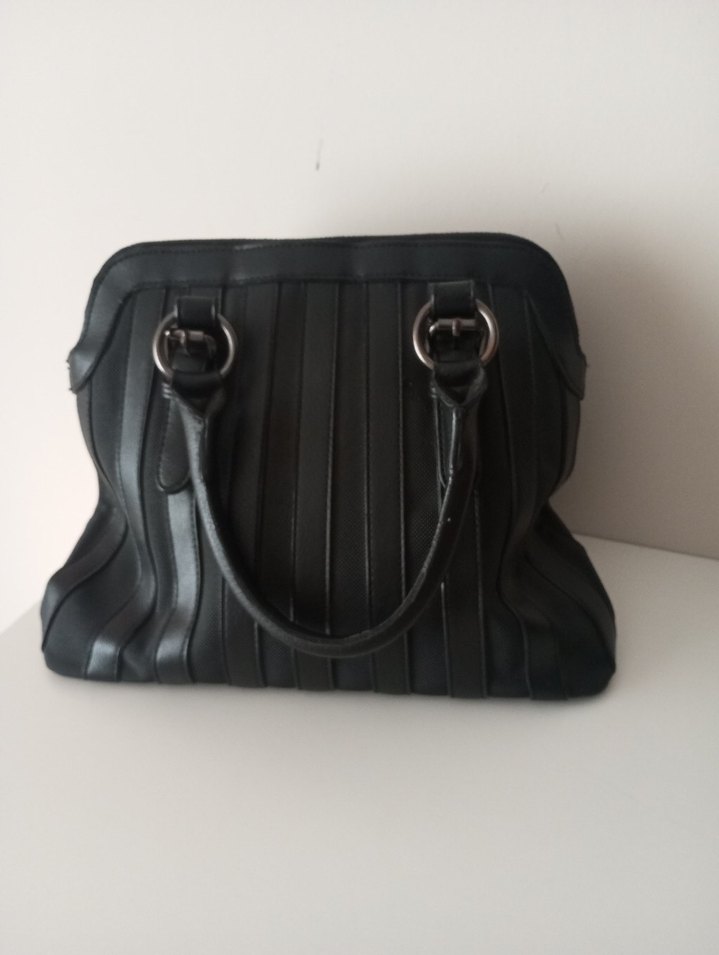 Tokalı askıları ve gotik tarzıyla siyah deri kadın çantası. Günlük kullanıma uygun, desen içermeyen şık tasarım.