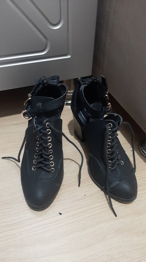 Tokalı ve bağcıklı siyah deri, blok topuklu botlar. Gotik tarzıyla romantik akşamlar için uygun.