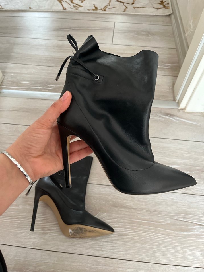 Tokalı siyah deri kadın botları, ince topuklu ve romantik akşamlar için uygun. Modern Paris tarzında, desensiz ve şık tasarım.
