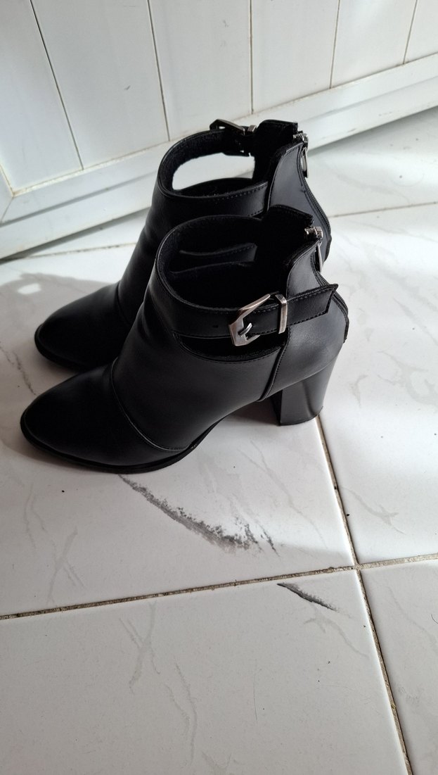Tokalı detaylara sahip siyah deri kadın botları, blok topuklu ve minimalist goth tarzında, günlük kullanıma uygundur. Fotoğrafta görüldüğü gibi topuklarda sürtünmeye bağlı izler var bunun dışında hiç bir sorunu yok.