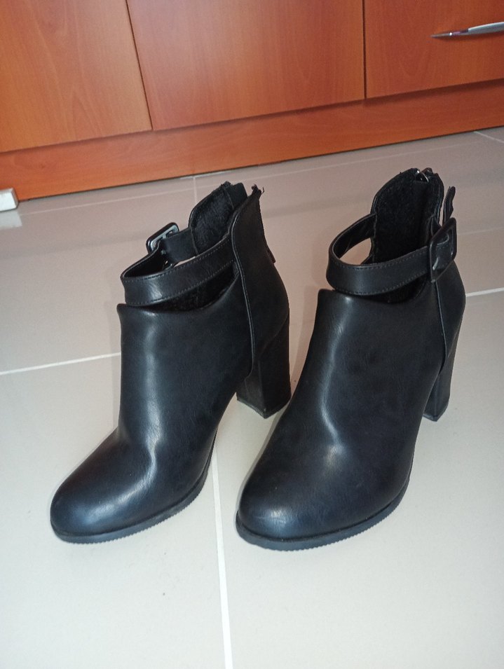 Siyah deri, tokalı ve kalın topuklu kadın botu, minimalist gotik tarzda günlük kullanıma uygun.