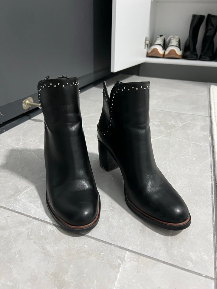 Tokalı detaylı, siyah deri kadın bot. Blok topuklu ve ince zımbalı süslemelidir. Günlük kullanıma uygun, trend gotik tarzda. Sadece topuklarındaki lastikleri yok