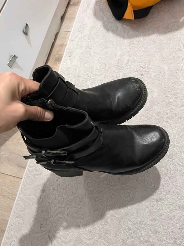 Siyah deri kadın bot, tokalı ve blok topuklu, gotik ve grunge punk tarzıyla trendy casual görünüme sahip . Ufak deformeler mevcut