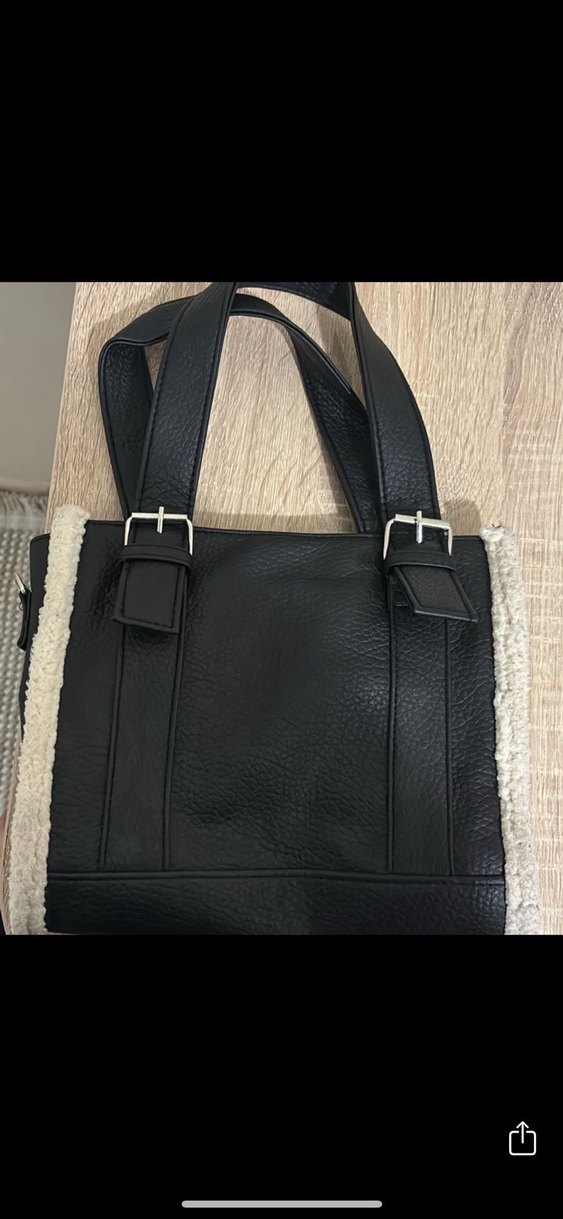 Tokalı kayışları ve yumuşak gri detayları olan siyah deri kadın çantası, trend sokak stili için uygun.