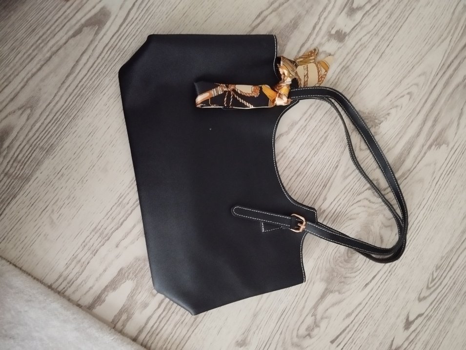 Tokalı detaylı siyah deri kadın çanta, dekoratif fular ile. Günlük kullanıma uygun, trend sokak stili.