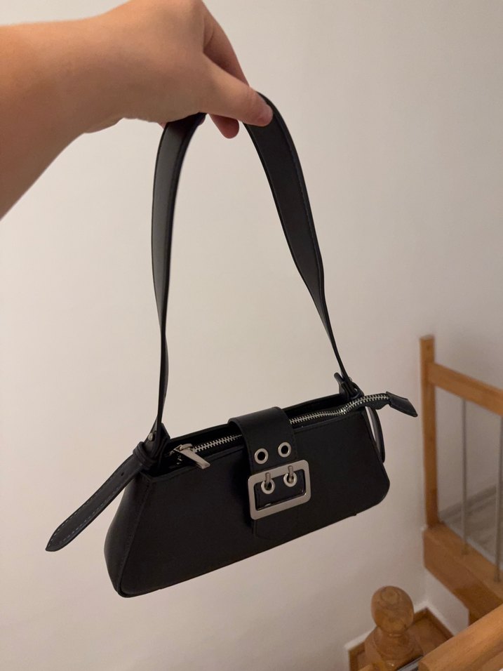 Tokalı detaylı siyah deri kadın çantası, minimalist ve gotik tarzda. Günlük kullanım için cesur bir görünüm sunar.