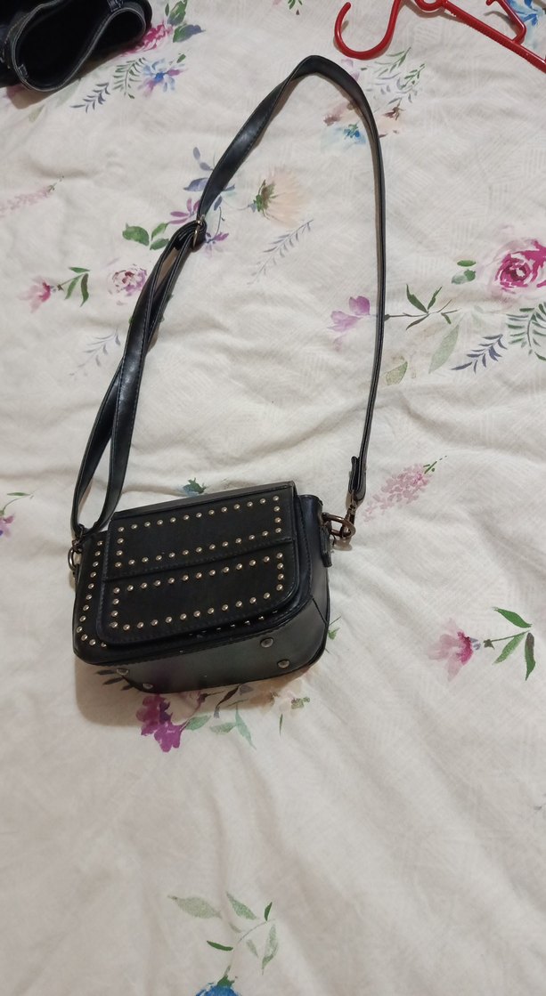 Tokalı askısı ve nakış detayları olan siyah deri kadın çantası, gotik ve bohem tarzda, günlük kullanım için uygundur.