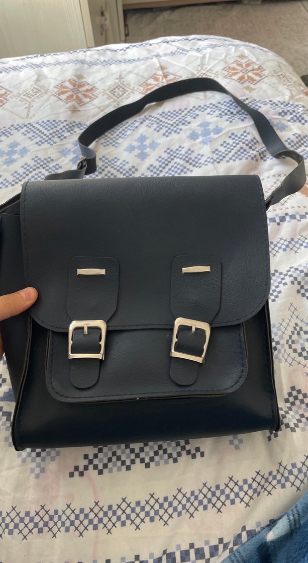 Tokalı kapaklı ve ayarlanabilir askılı siyah deri kadın çantası, desensiz ve düz yüzeye sahiptir.