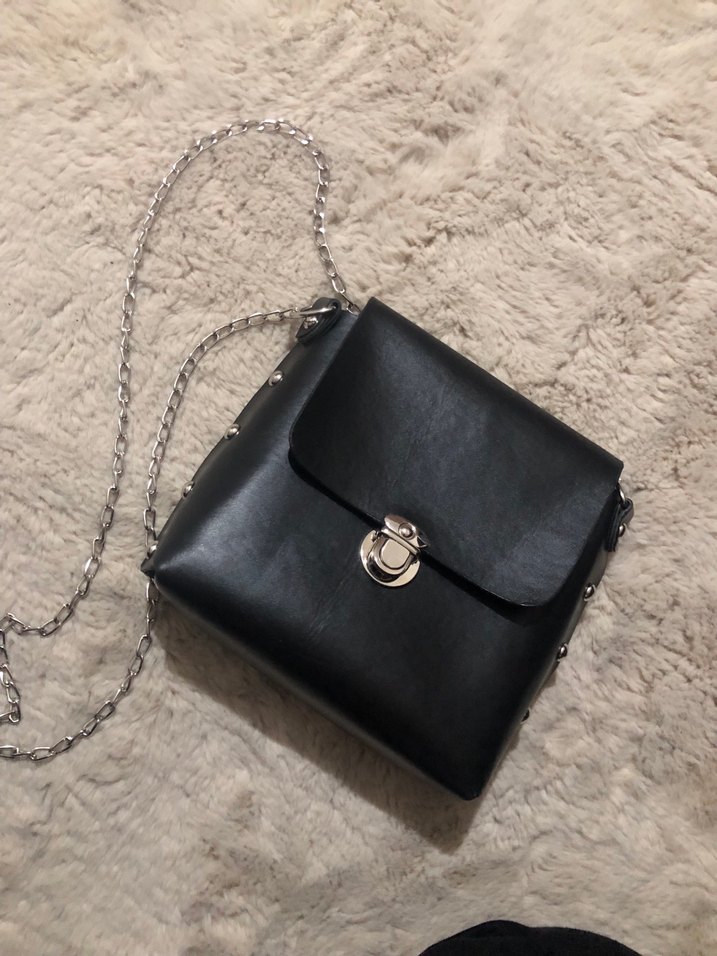 Siyah deri kadın çantası, tokalı kapak ve zincir askıyla, düz yüzeyli ve koyu gotik tarzda.