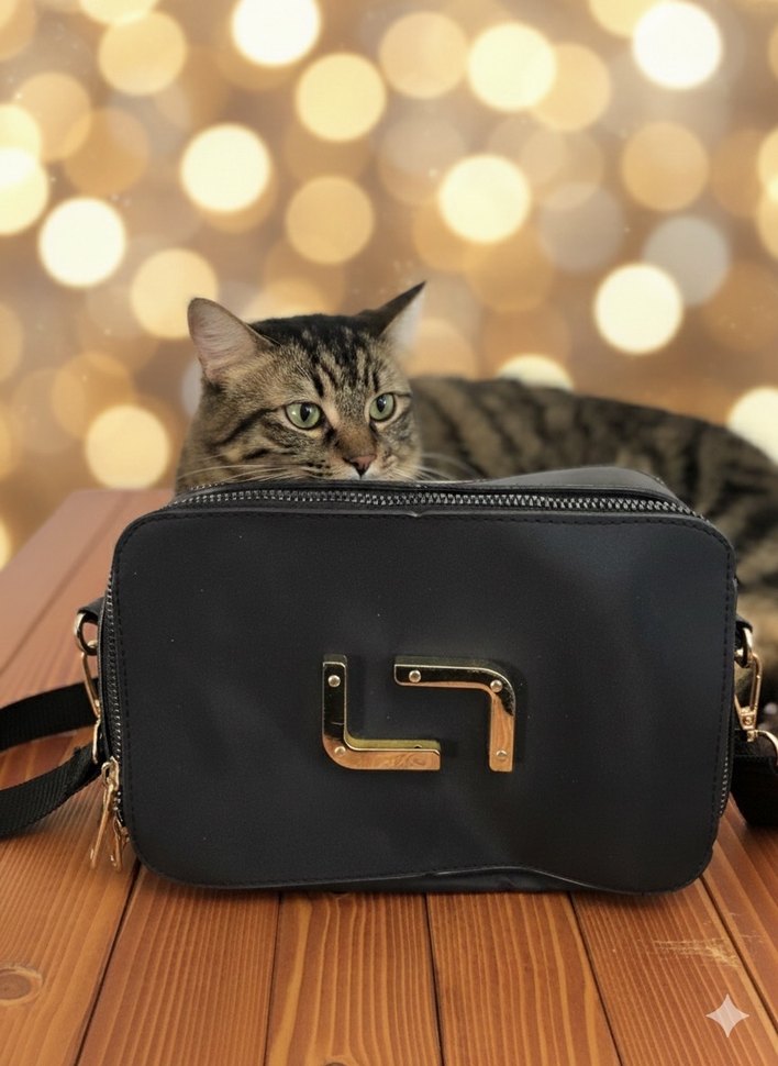 Tokalı detaylı siyah deri kadın çantası, trend sokak stili için uygundur. Önünde altın renkli logo bulunur.