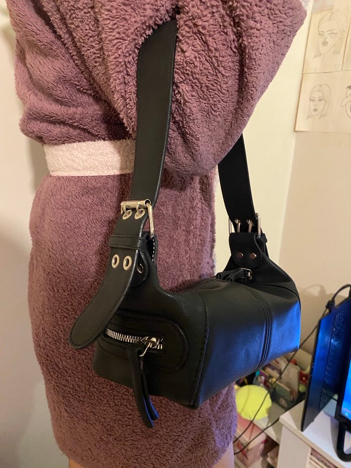 Tokalı detaylara sahip siyah deri kadın çanta, grunge punk tarzında. Desensiz ve günlük kullanım için uygun.