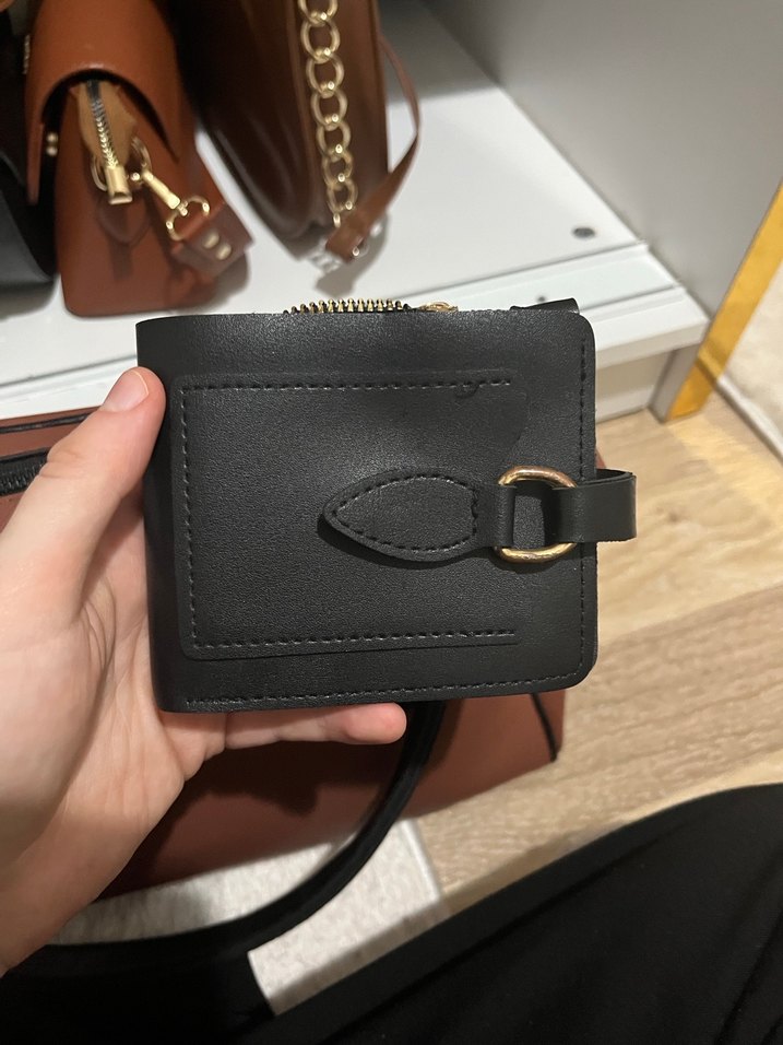 Siyah deri kadın cüzdanı, tokalı tasarım ve baskılı desenle günlük kullanıma uygun, trend sokak stilini yansıtıyor. Sayılı kullanıldı.