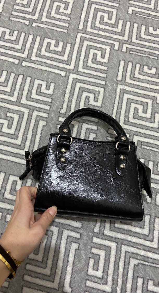 Tokalı detaylara sahip siyah deri kadın el çantası, gotik tarzda ve gri tonlarında. Trendy günlük kullanıma uygun.