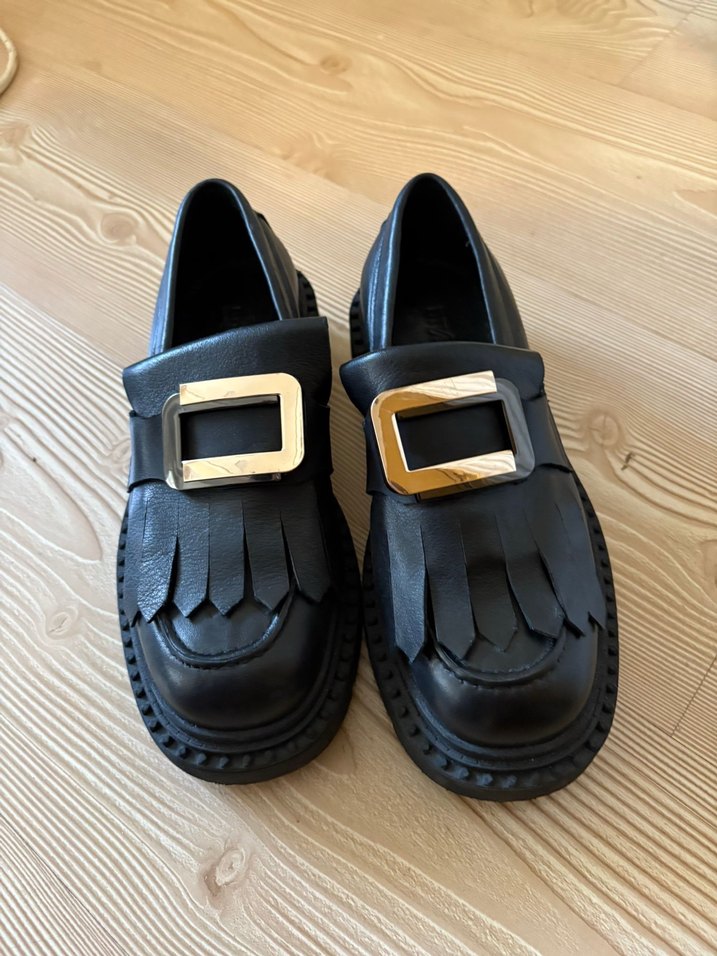Siyah deri kadın loafer, büyük altın tokası ve püskül detayları ile gotik tarzda, desensiz tasarım. Trend belirleyiciler için uygun.