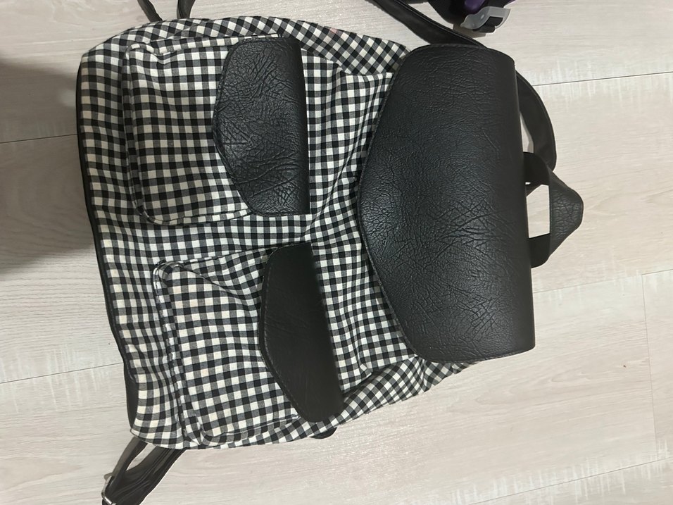 Siyah deri, tokalı, kare desenli iç astarlı kadın sırt çantası. Günlük kullanıma ve trend sokak stiline uygundur.