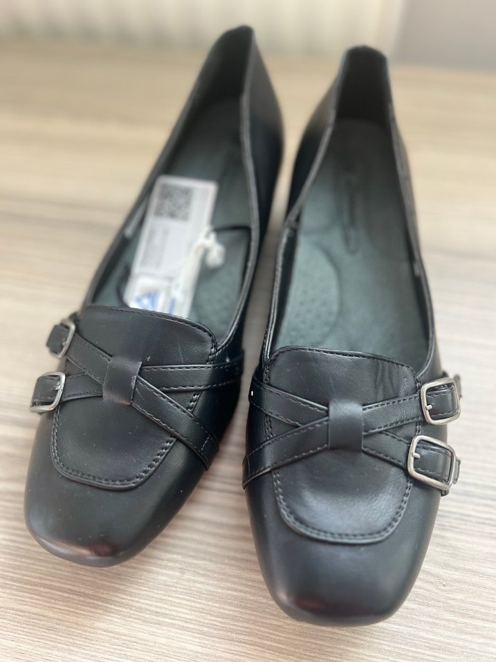 Ofis ve günlük şıklık için çift tokalı siyah deri kadın topuklu ayakkabı.