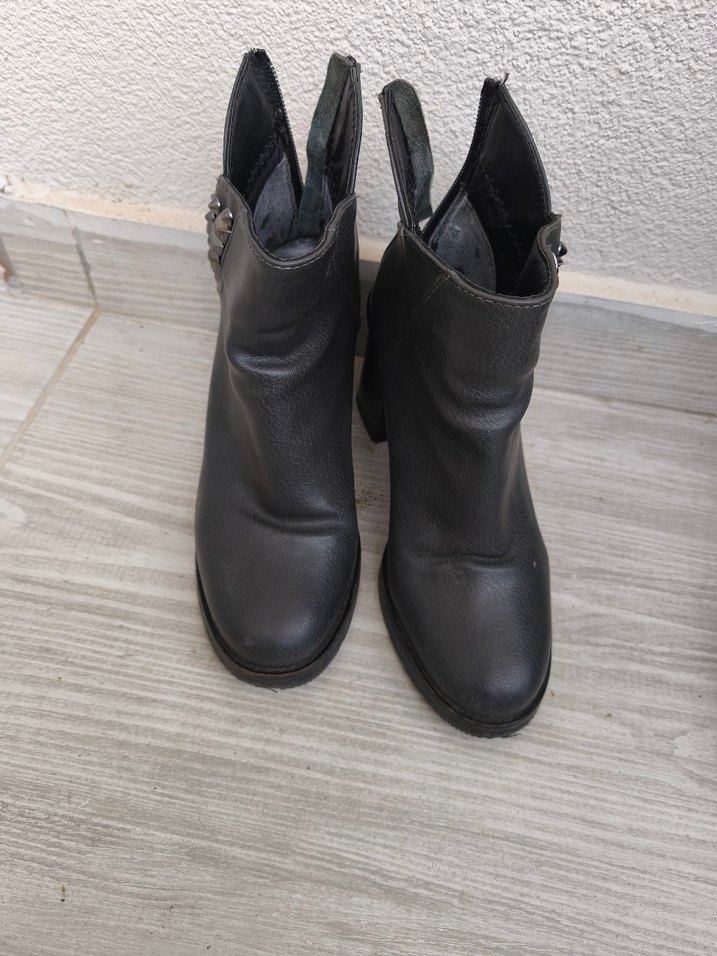 Tokalı siyah deri kadın botları, blok topuklu ve minimalist goth tarzında. Gri tonlarında, günlük kullanıma uygun desensiz tasarım.