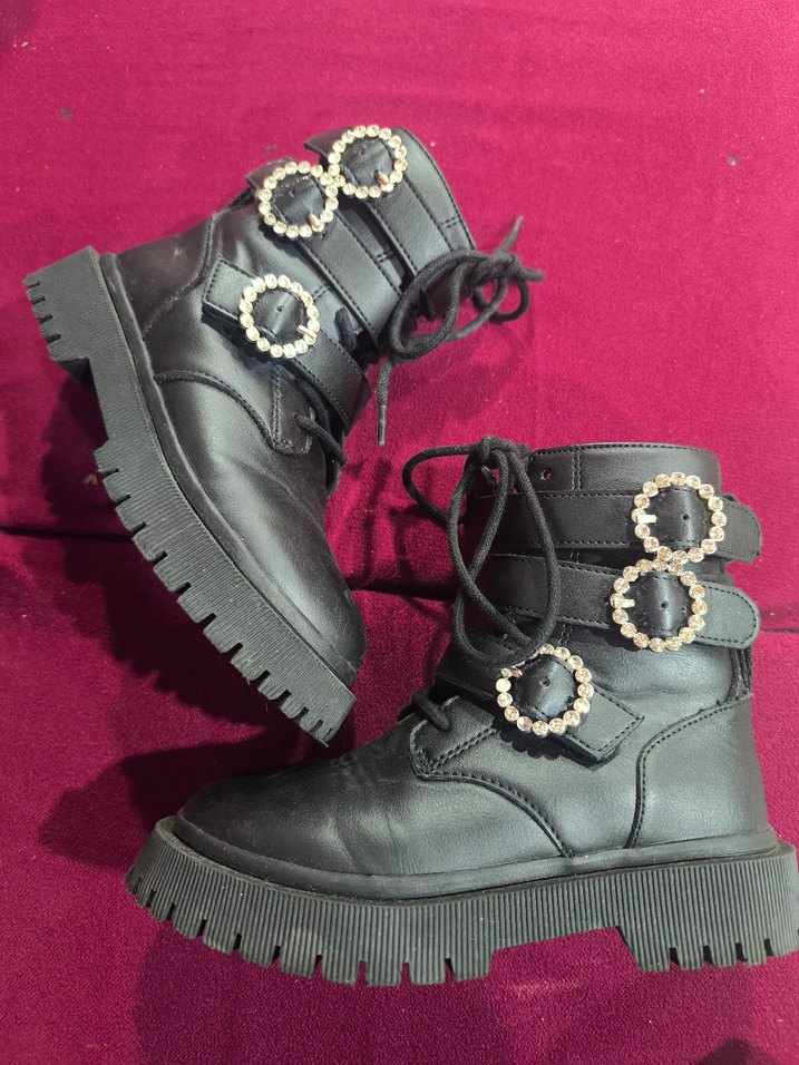 Siyah deri platform topuklu botlar, tokalı ve desenli detaylarla grunge punk tarzını yansıtıyor. Günlük kullanıma uygun sağlam tabanlı.