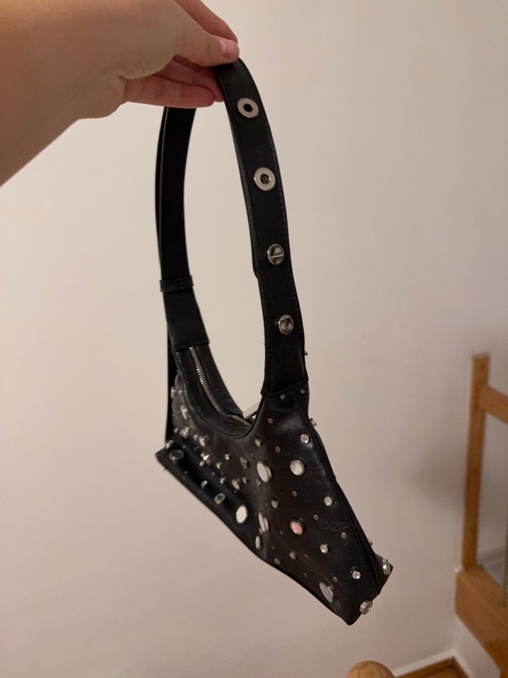 Siyah deri, puantiyeli ve tokalı detaylara sahip çanta. Goth ve grunge punk tarzını yansıtır. Romantik akşamlar için uygun.