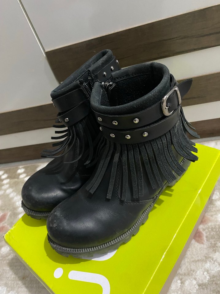 Yüksek topuklu siyah deri botlar tokalı kayışlar ve püskül detayları içerir. Metal perçinler ve desenli tasarım taşır, rock punk tarzı için uygundur.