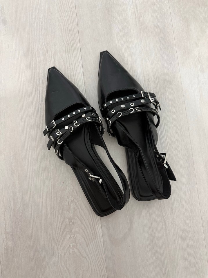 Sivri burunlu ve stiletto topuklu siyah deri kadın ayakkabıları, çoklu tokalı kayışlarla gotik rock punk tarzını yansıtıyor. Günlük kullanıma uygun.